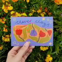 A wooden clog adorned with tulips and complete with bright stars complete with a hand written 'Clever Clogs' greeting. 🌟
