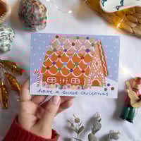 A delicious illustrated gingerbread house covered in icing, candy canes and colourful sweets. The ideal Christmas greeting for that friend or family member with a sweet tooth 🍭 With a handwritten Sweet Christmas message on the front this card makes a unique festive greeting for friends and family alike!